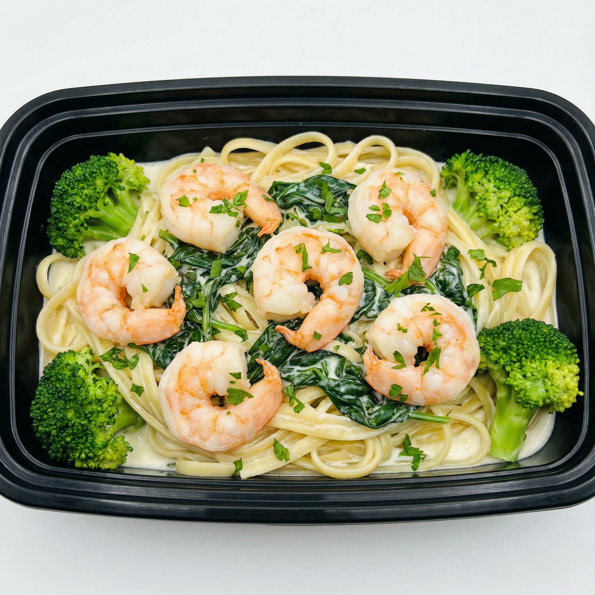 Be the first to review “Shrimp Alfredo w/ spinach over linguine noodles, broccoli and alfredo sauce, parsley”